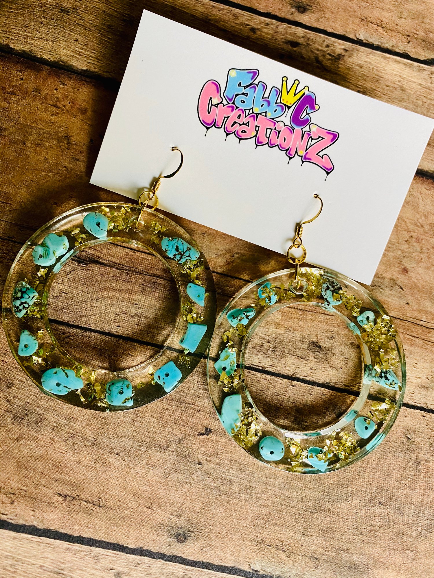 Resin earrings encapsulated with Turquoise beads & 10k gold flakeys.